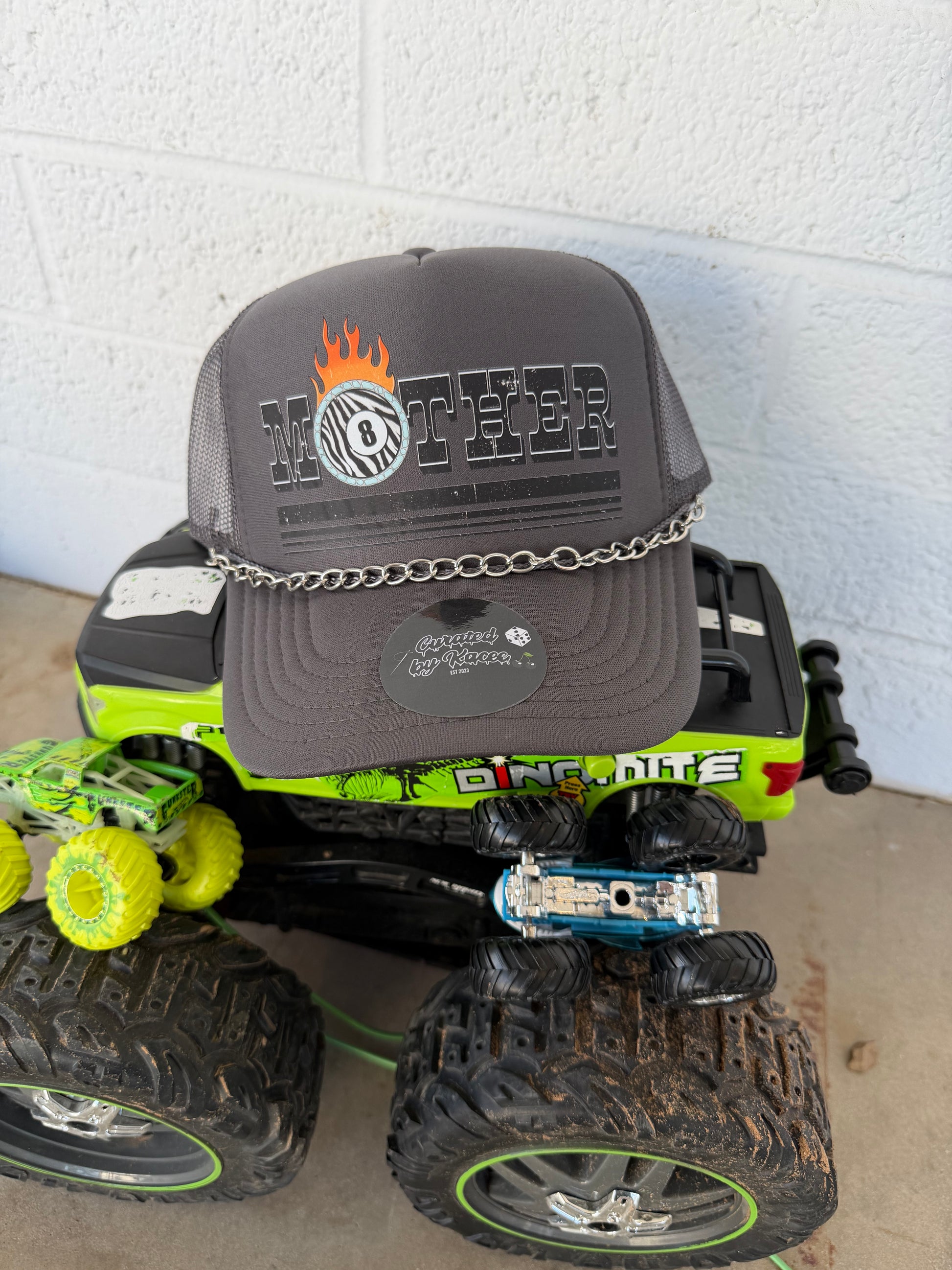 Gray foam trucker hat with transfer & silver metal hat chain.